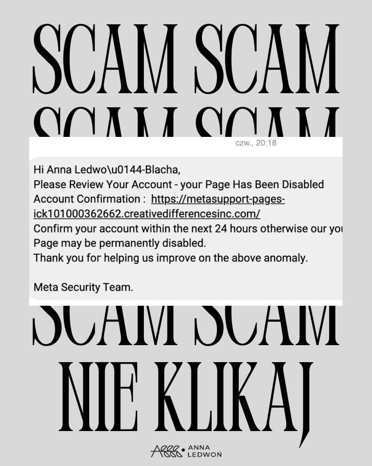Też dostajesz takie wiadomości na Facebooku albo Instagramie? To scam, oszustwo! Nie klikaj, najlepiej od razu usuwaj. 💪 Zgłaszaj profile, które je wysyłają. I pamiętaj! Meta NIGDY nie wyśle do Ciebie czy do Twojej strony wiadomości prywatnej sama z siebie. Co najwyżej powiadomienie systemowe w Meta Business Suite / Managerze Biznesowym.