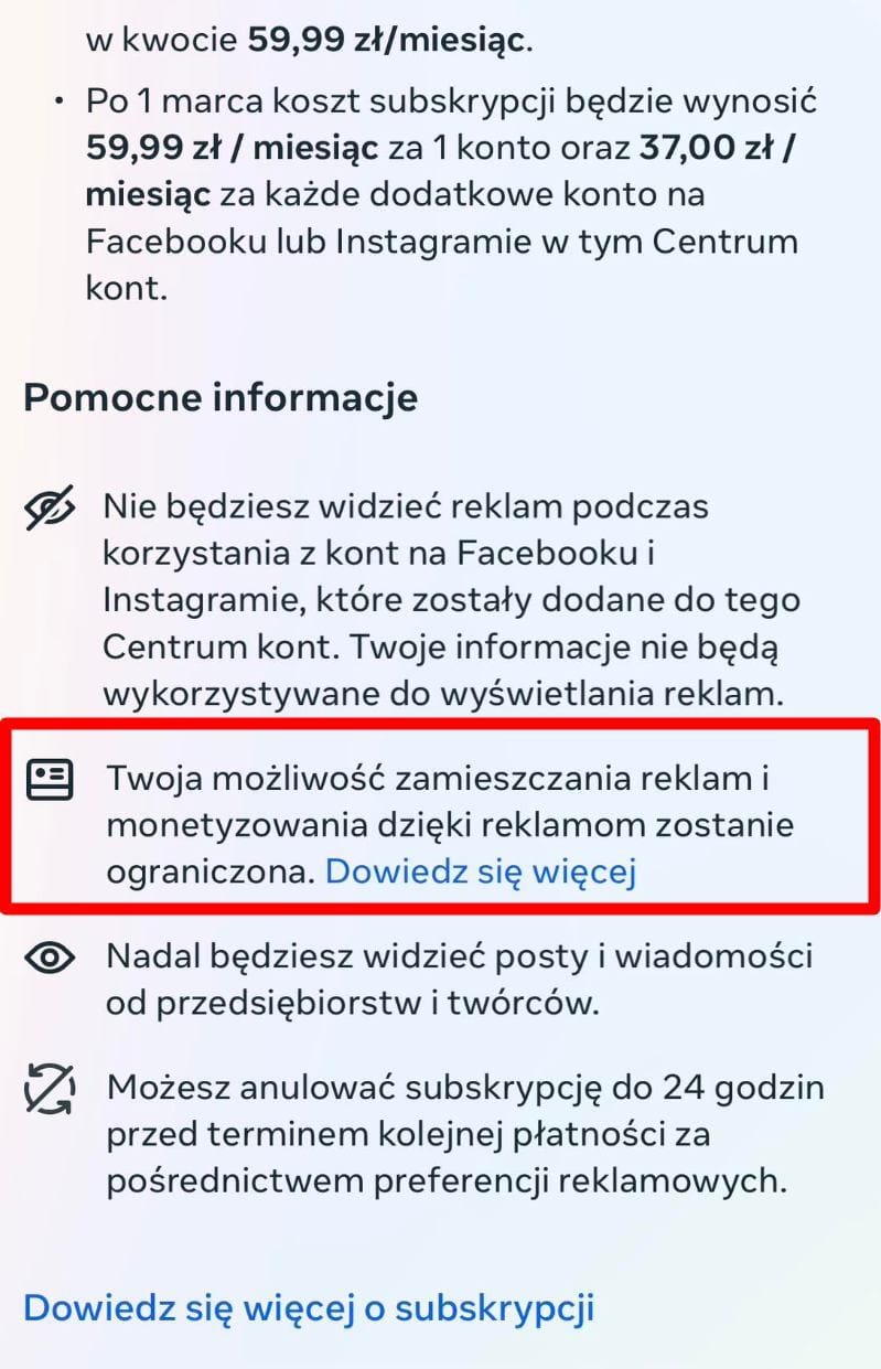 Tymczasem w sieci również spore zaskoczenie, że po wykupieniu Mety bez reklam 👉 nie można puszczać reklam. Czy zaskoczenie powinno się pojawić? Niekoniecznie. 😈 O ile mogę uśmiechać się pod nosem z łańcuszków, o tyle "zwykły Kowalski" nie siedzi w narzędziach profesjonalnie. My jako marketerzy chyba jednak powinniśmy. 🙃 I powinniśmy zwracać uwagę na wszystkie "dowiedz się więcej" i "pomocne informacje" rozwiązań, które nabywamy, bo mają wpływ na naszą pracę i wyniki naszych klientów.
